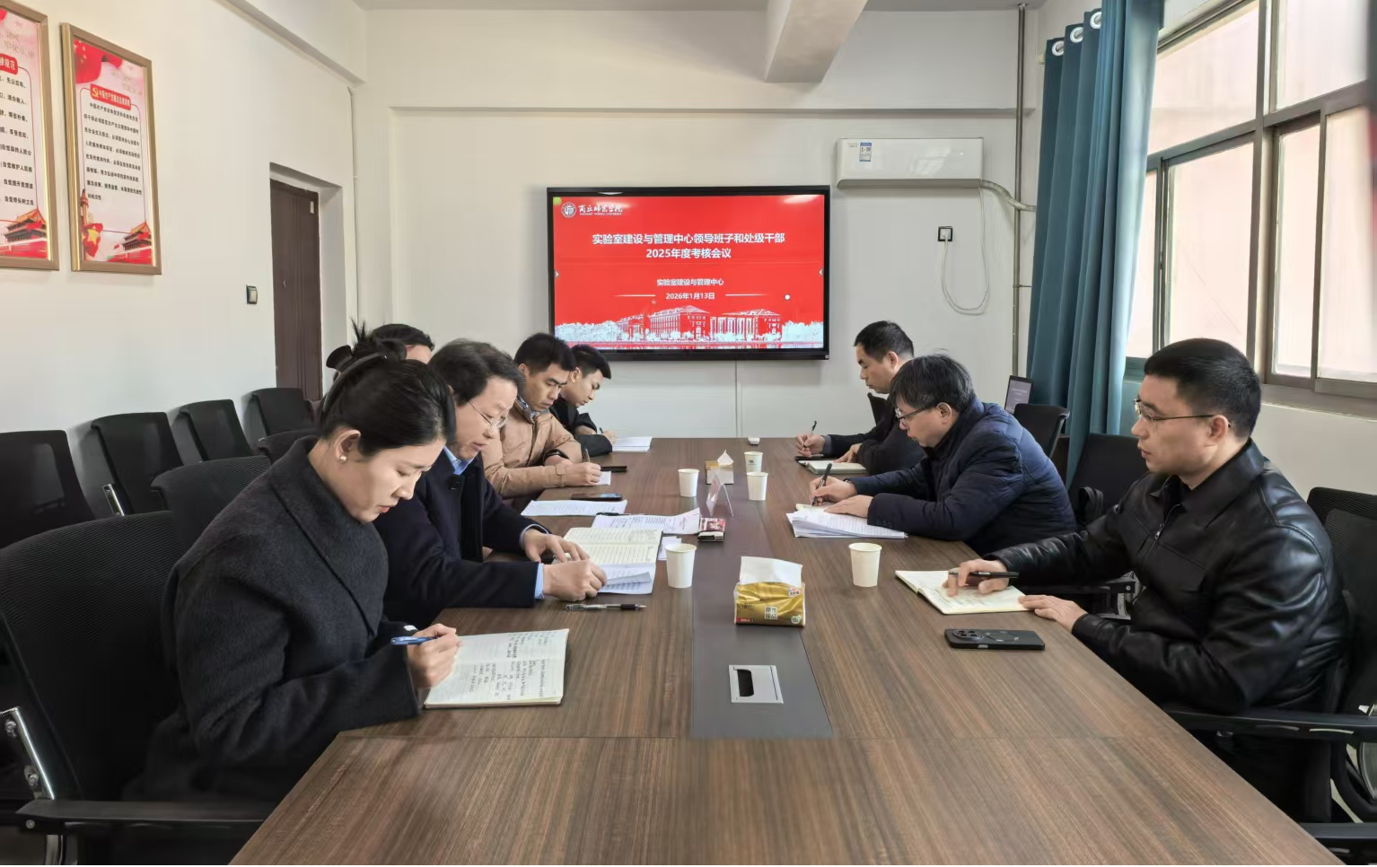 为了全面总结2025年度各项工作,考核处级干部履职情况,实验室建设与管理中心于2026年1月13日在梁园校区应天楼616会议室召开2025年度中层干部考核会议。学校第七考核组组长刘澜涛副校长出席会议,组员有组织部副部长罗永刚、第二纪检监察室副主任李斌,实验室建设与管理中心全体成员参加了会议。